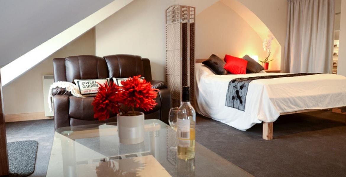 Inside, the apartment feels bright and spacious thanks to large Velux windows that flood the space with natural light. The well-designed layout makes excellent use of space, featuring a dedicated study area with desk and chair — perfect for home working or university study — alongside a comfortable leather sofa and dining table for relaxing or hosting friends.
