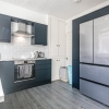 A stylish kitchen equipped with modern appliances, ample storage, and a dining table for shared meals or workspaces.